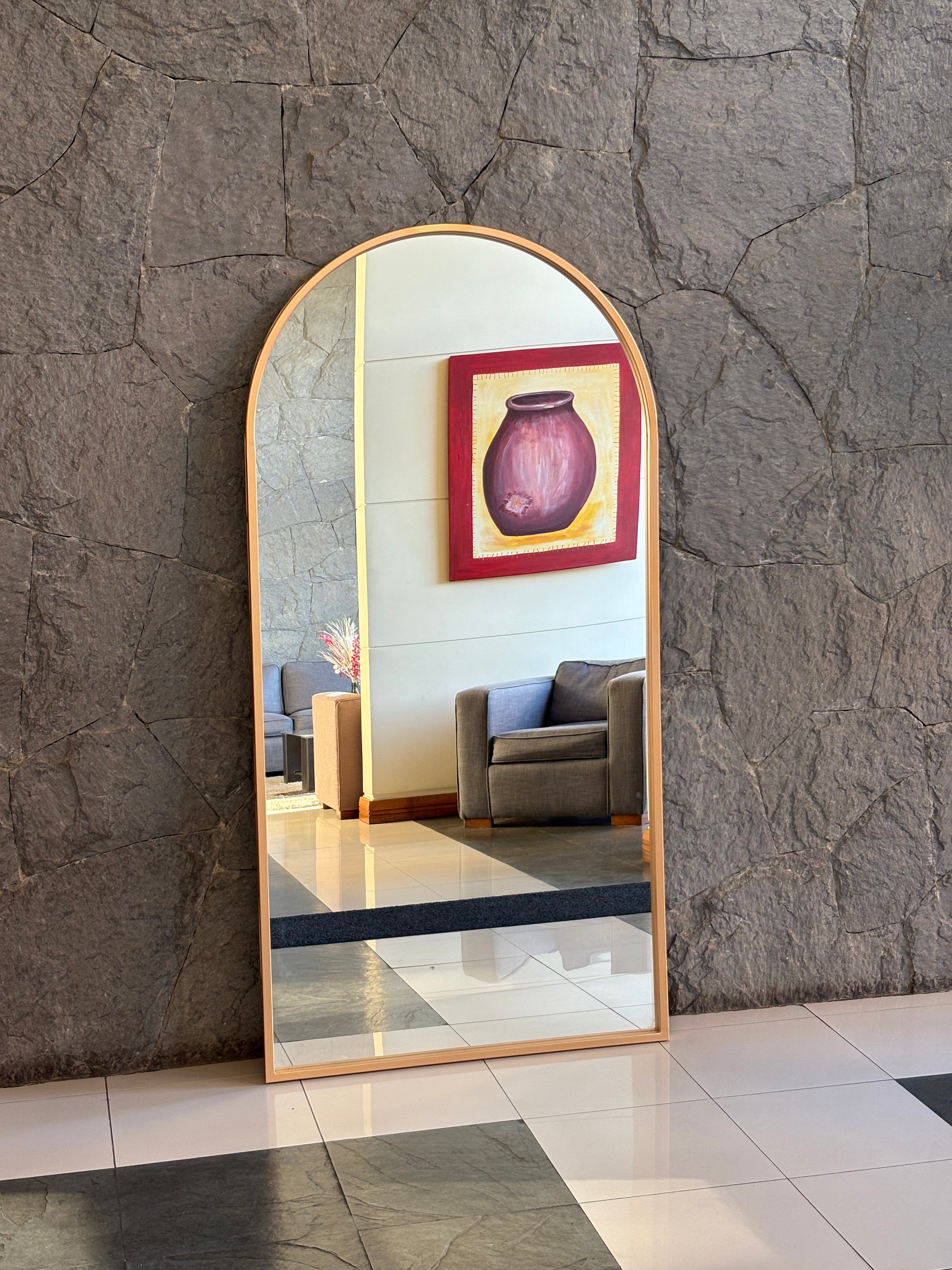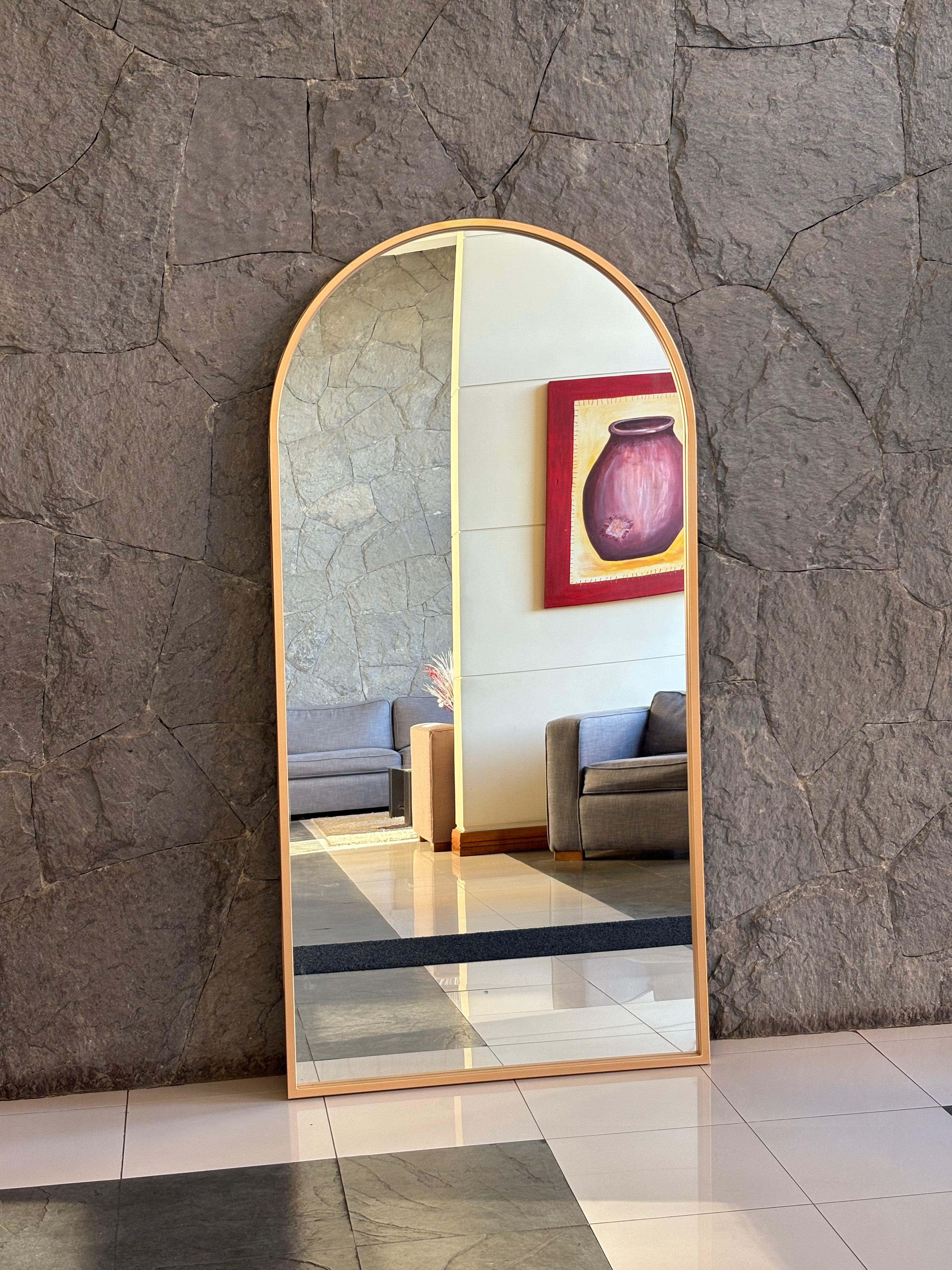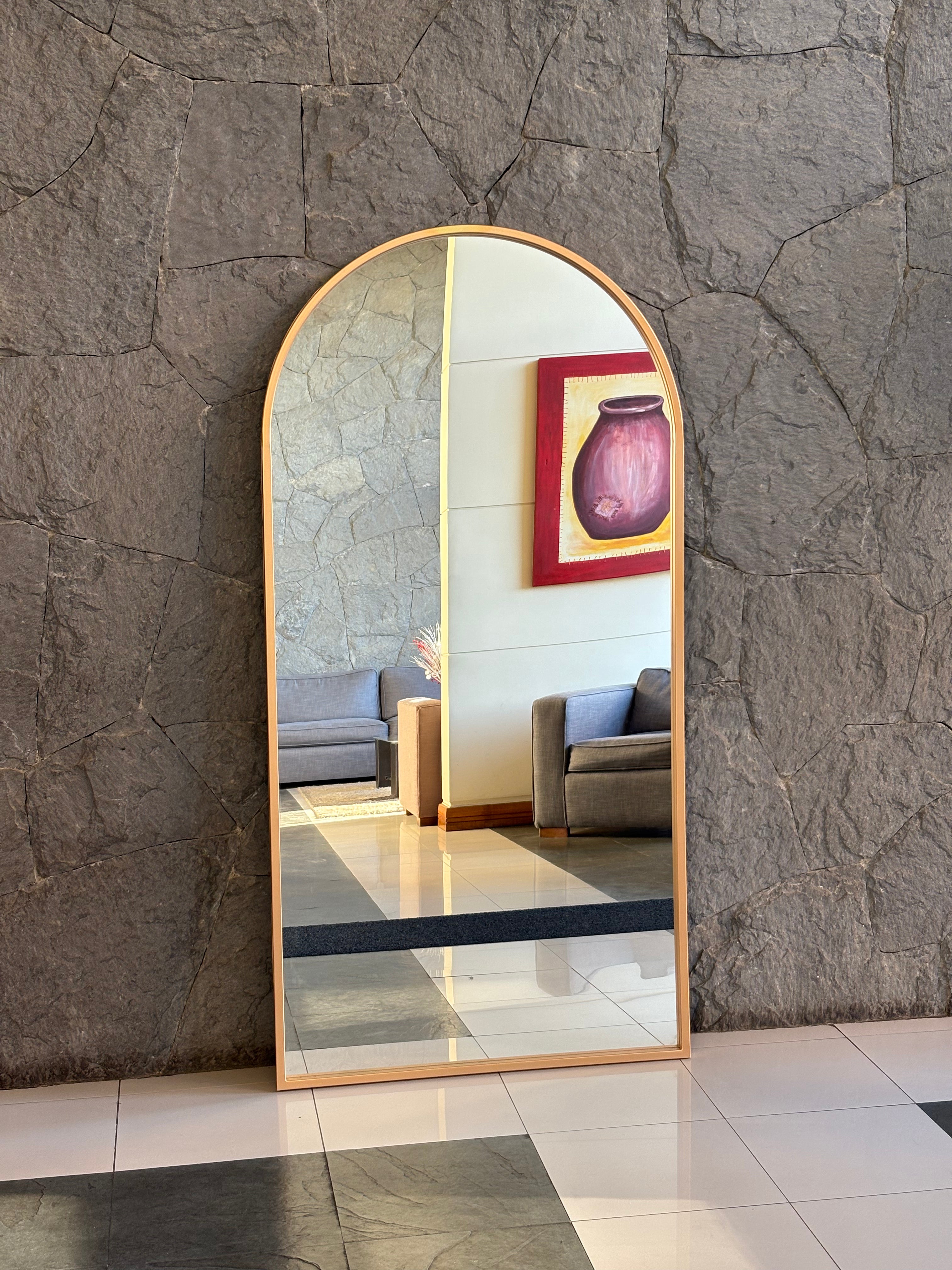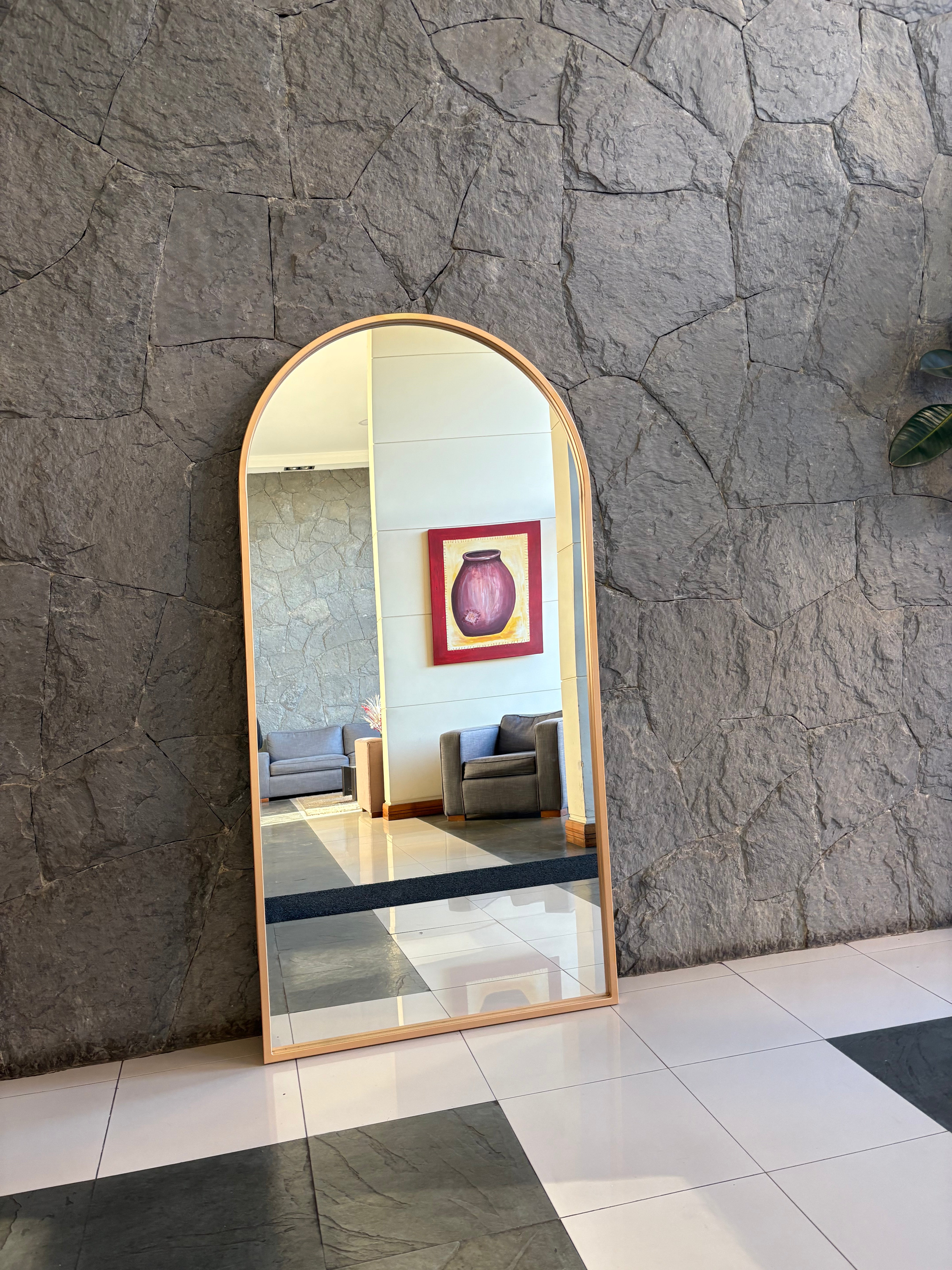 Este espejo en formato arco con marco de fierro es una pieza que ordena el espacio y lo hace sentir más alto, más profundo y más limpio visualmente. No decora por decorar: estructura.