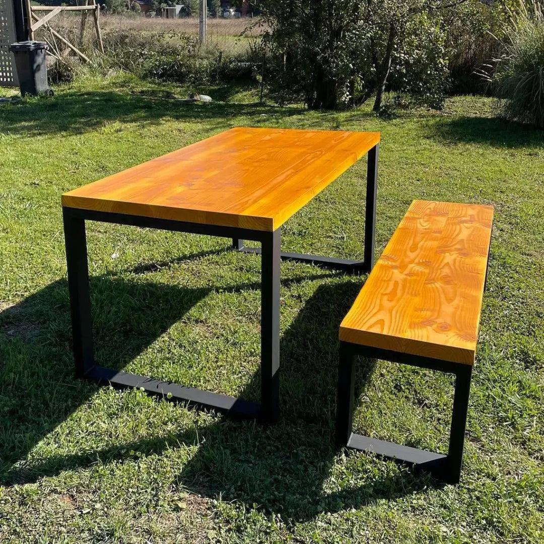 Su acabado en madera pulida realza la belleza natural del pino, mientras que la base metálica aporta estabilidad y un toque moderno. ¡La opción perfecta para disfrutar momentos especiales en un entorno único!