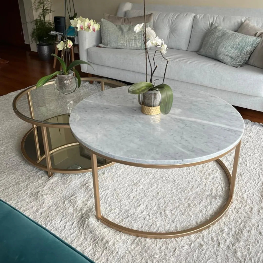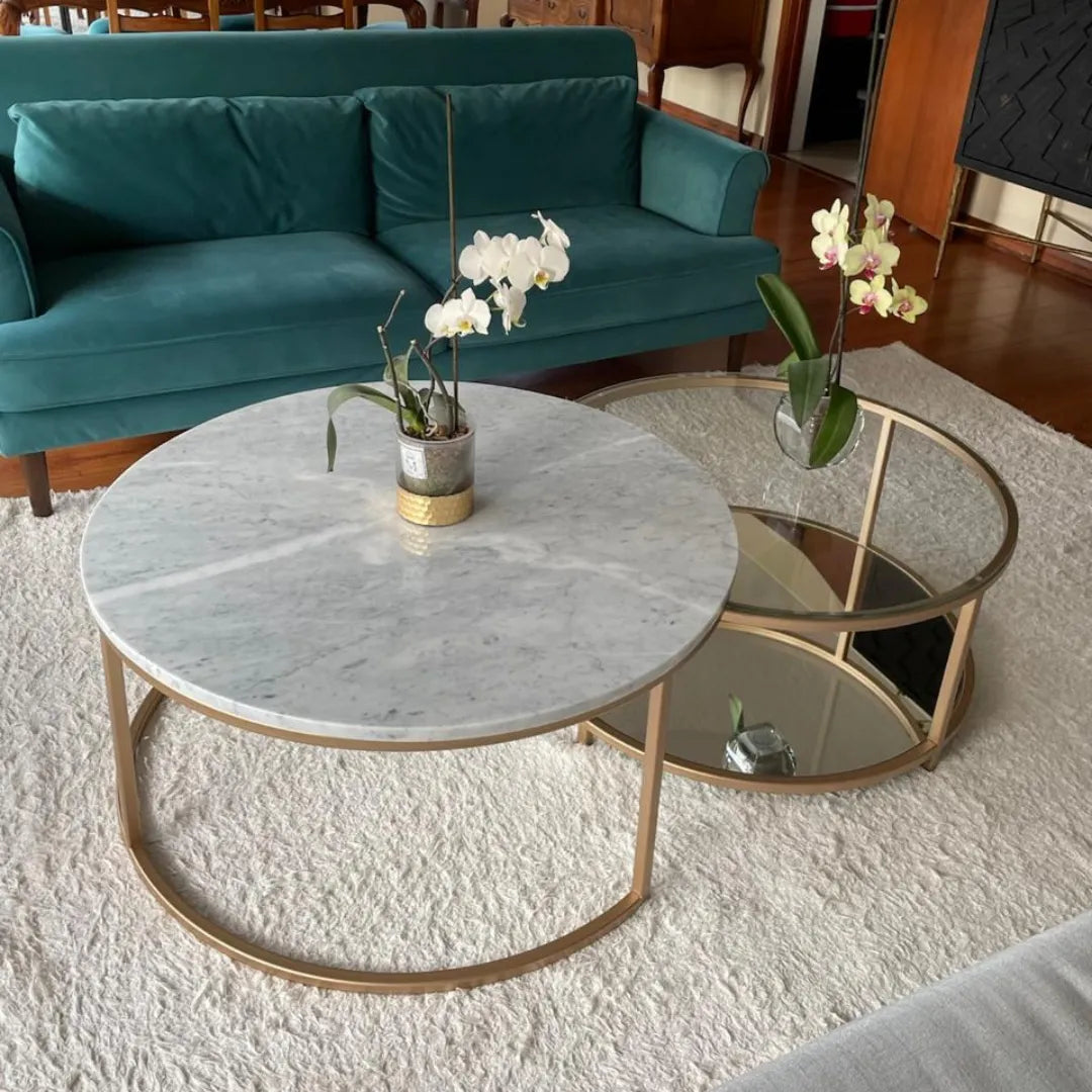 Este elegante set de mesas combina materiales de lujo y diseño contemporáneo para realzar cualquier espacio. La mesa principal cuenta con una cubierta de mármol de 90 cm de diámetro, mientras que la mesa auxiliar tiene una cubierta de vidrio sobre una base de espejo de 80 cm de diámetro. Su estructura metálica con acabado dorado aporta un toque sofisticado y moderno, ideal para salas de estar o rincones exclusivos.