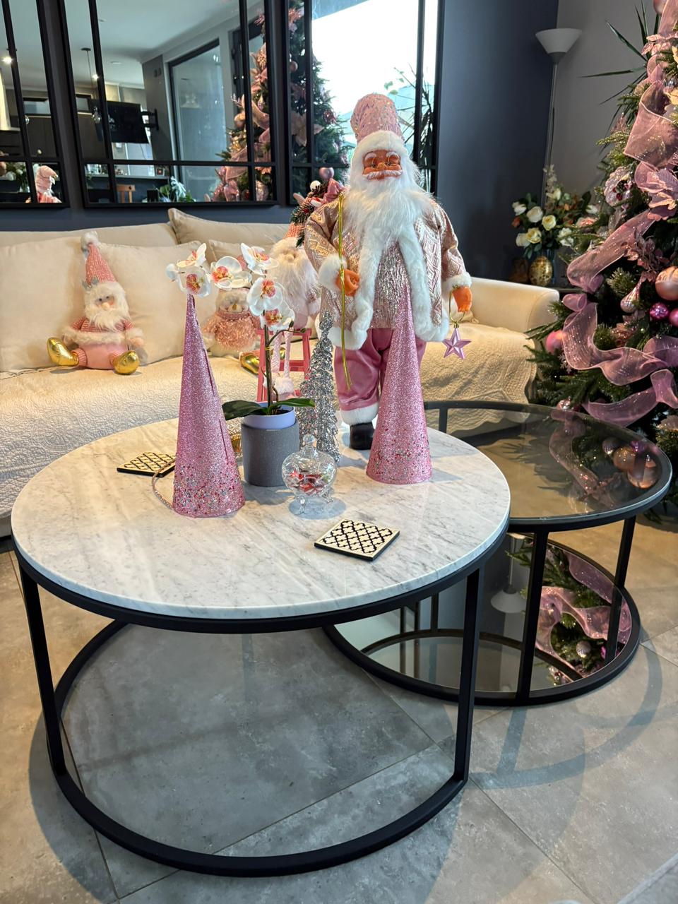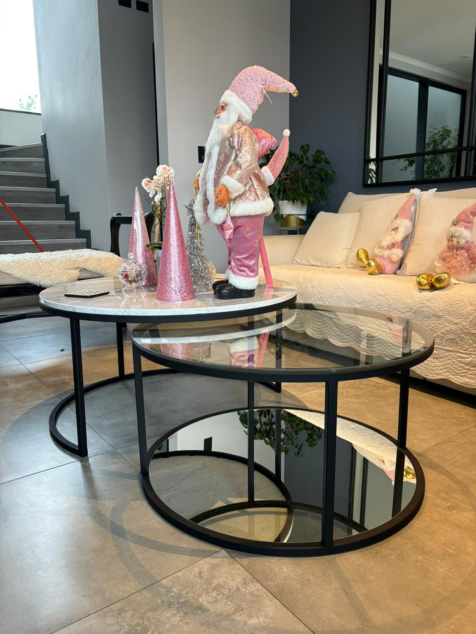 La mesa principal cuenta con una cubierta de mármol de 90 cm de diámetro, sólida, elegante y atemporal. La mesa auxiliar incorpora una cubierta de vidrio sobre una base con espejo, creando un juego visual que amplía el espacio y refleja la luz con sutileza.
