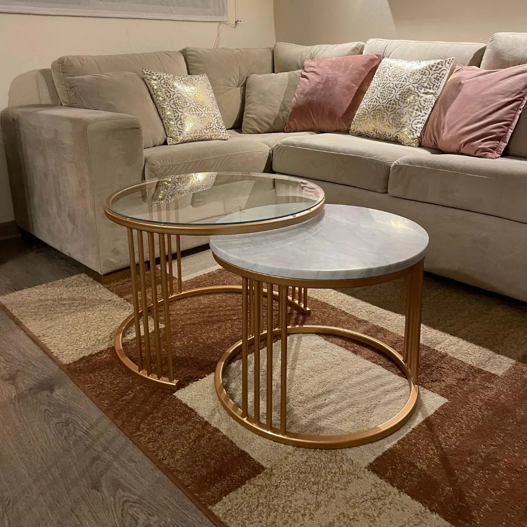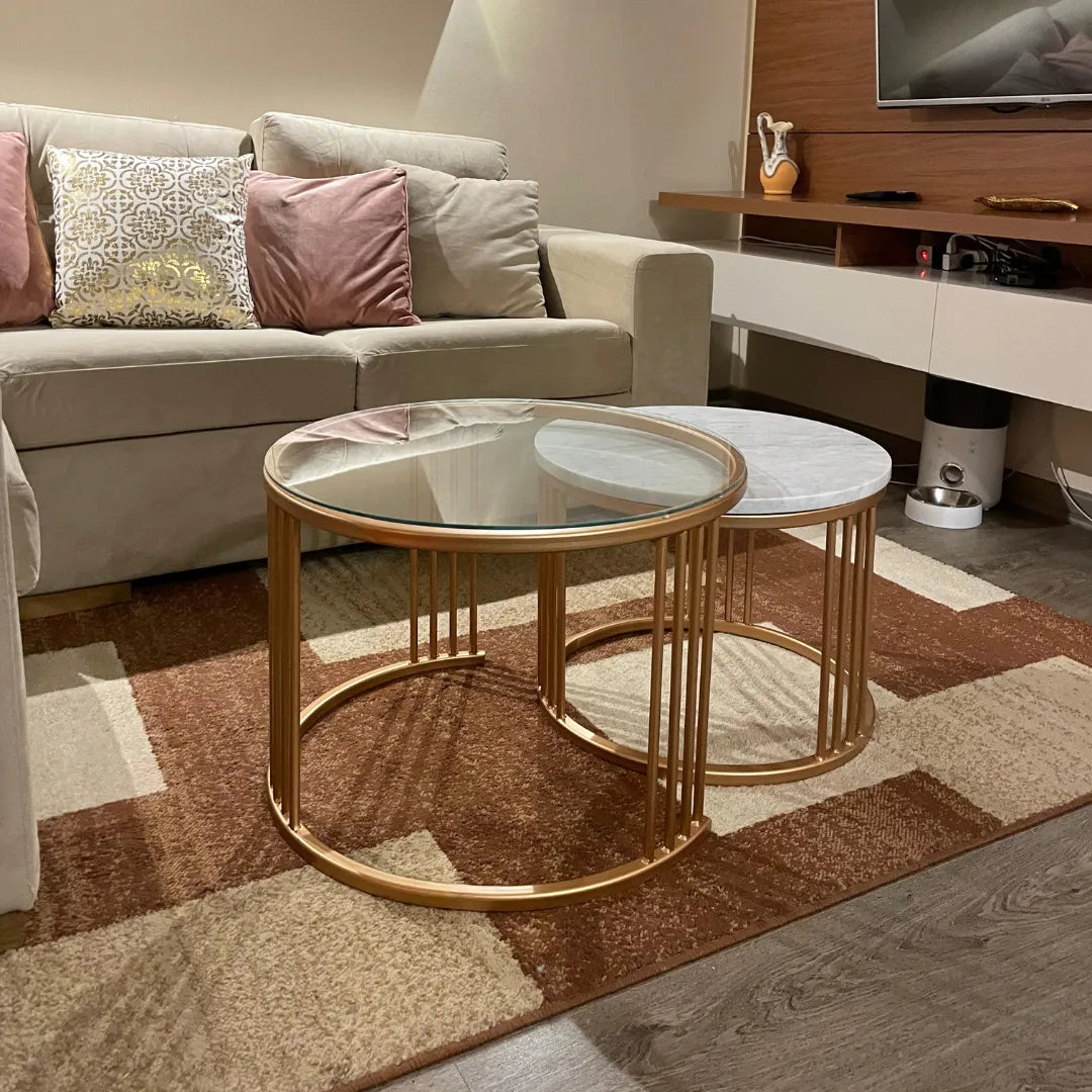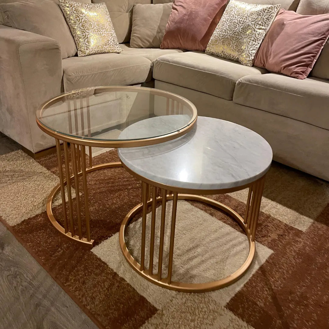 Con bases metálicas en acabado dorado y líneas elegantes, estas mesas son ideales para salas de estar, aportando estilo y funcionalidad. Perfectas para complementar tu decoración con un toque de lujo y modernidad. ¡Haz que cada rincón de tu hogar brille con este exclusivo set!